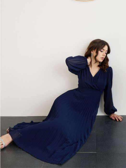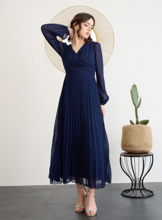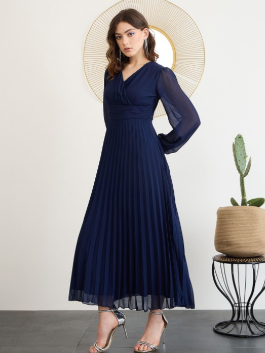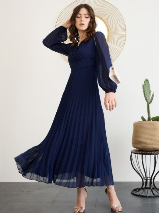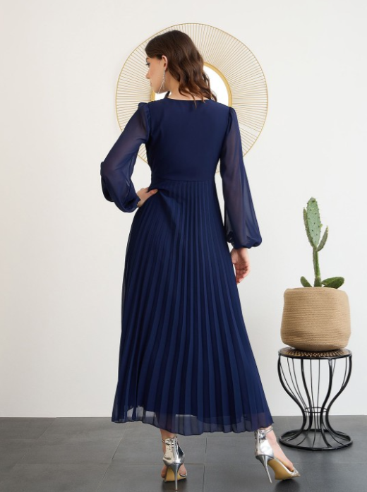V-Neck Bishop Sleeves Pleated Georgette Maxi Dress
