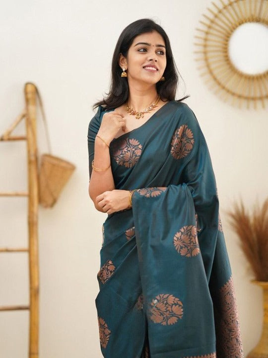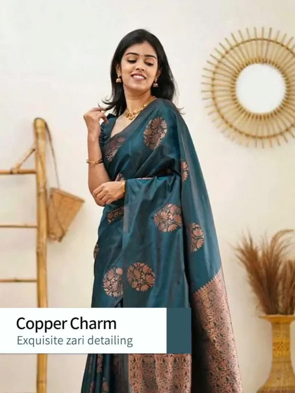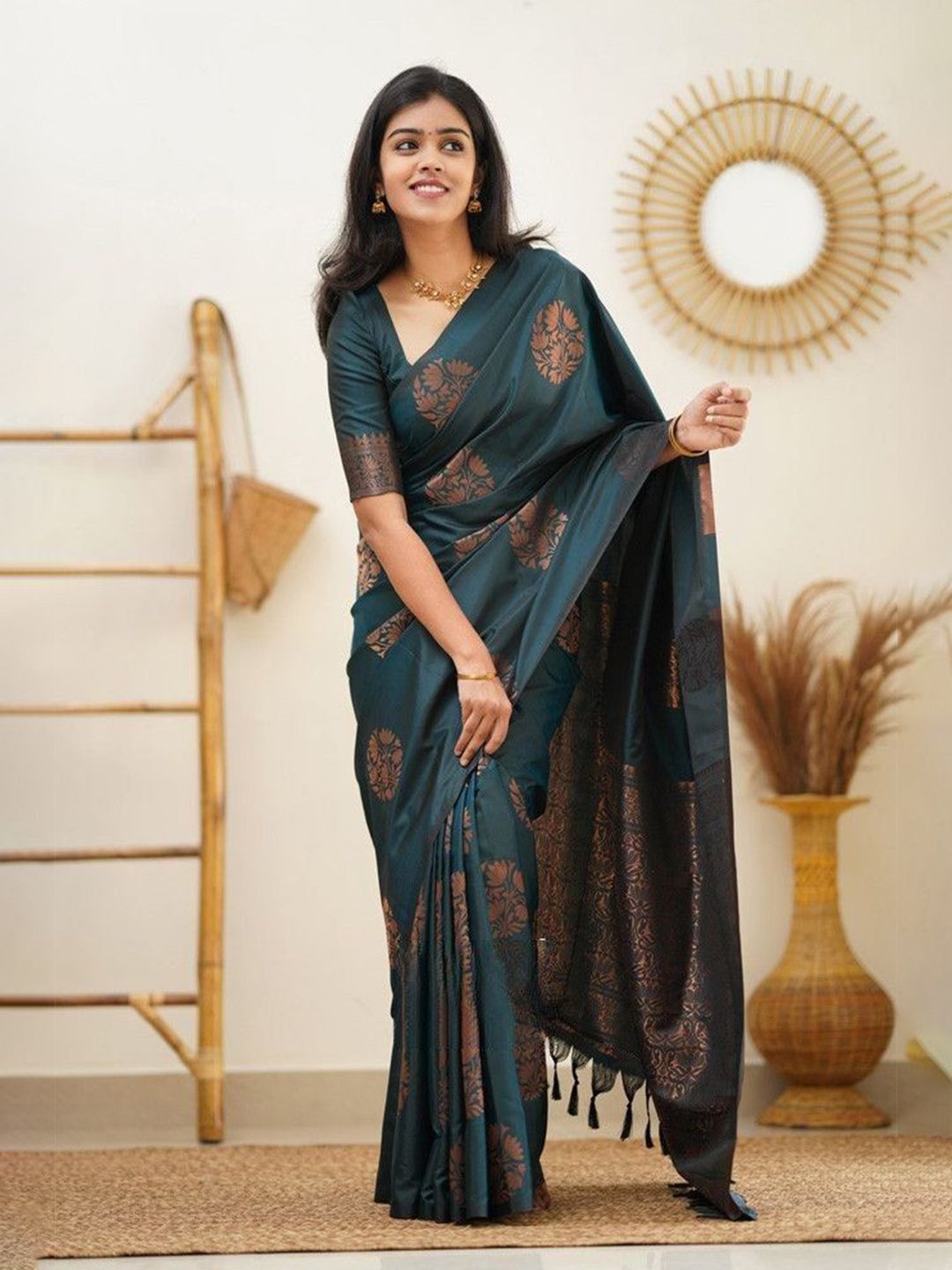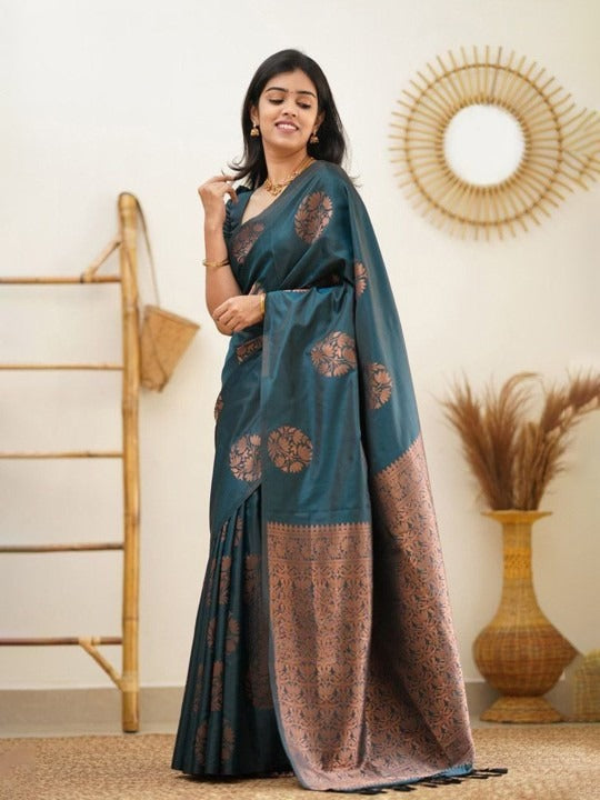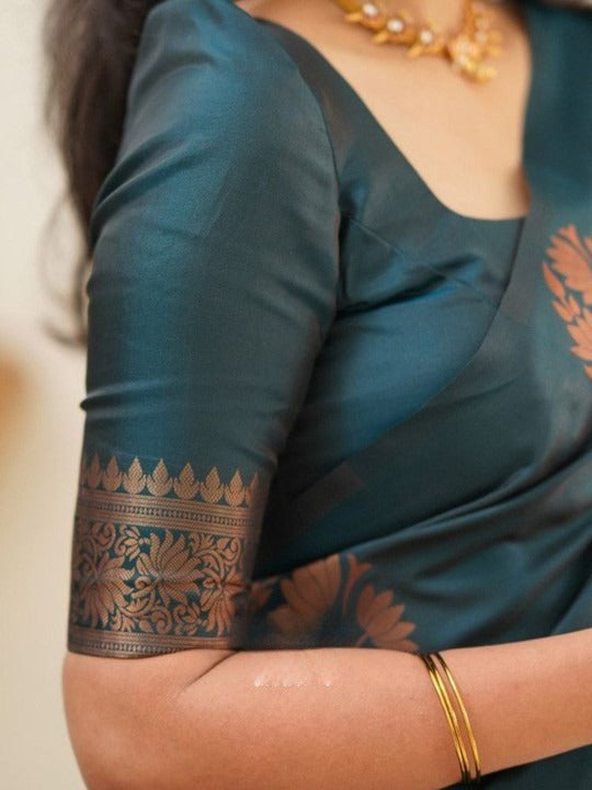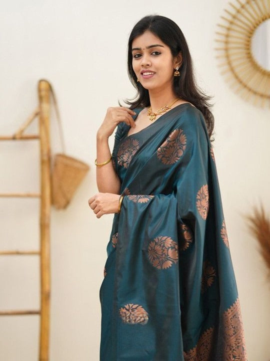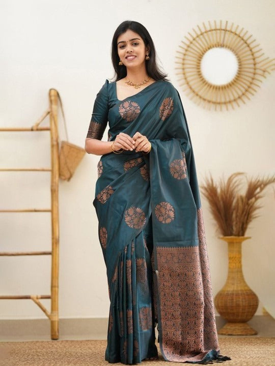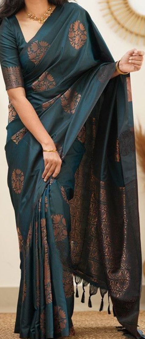 - Teal and copper-toned banarasi saree