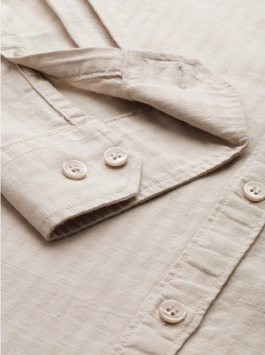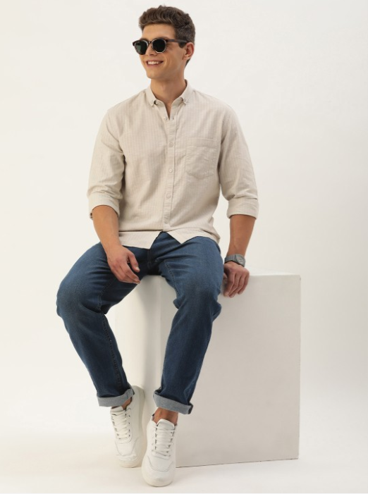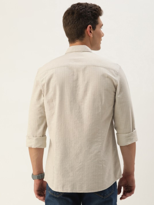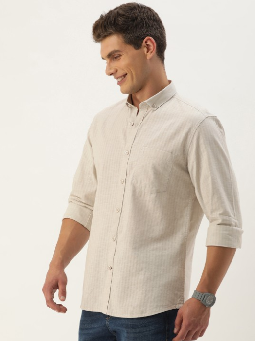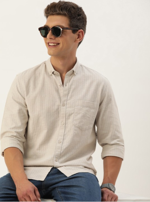 Grey vertical stripes striped opaque Casual shirt ,has a button-down collar, button placket, 1 patch pocket, long regular sleeves, curved hem